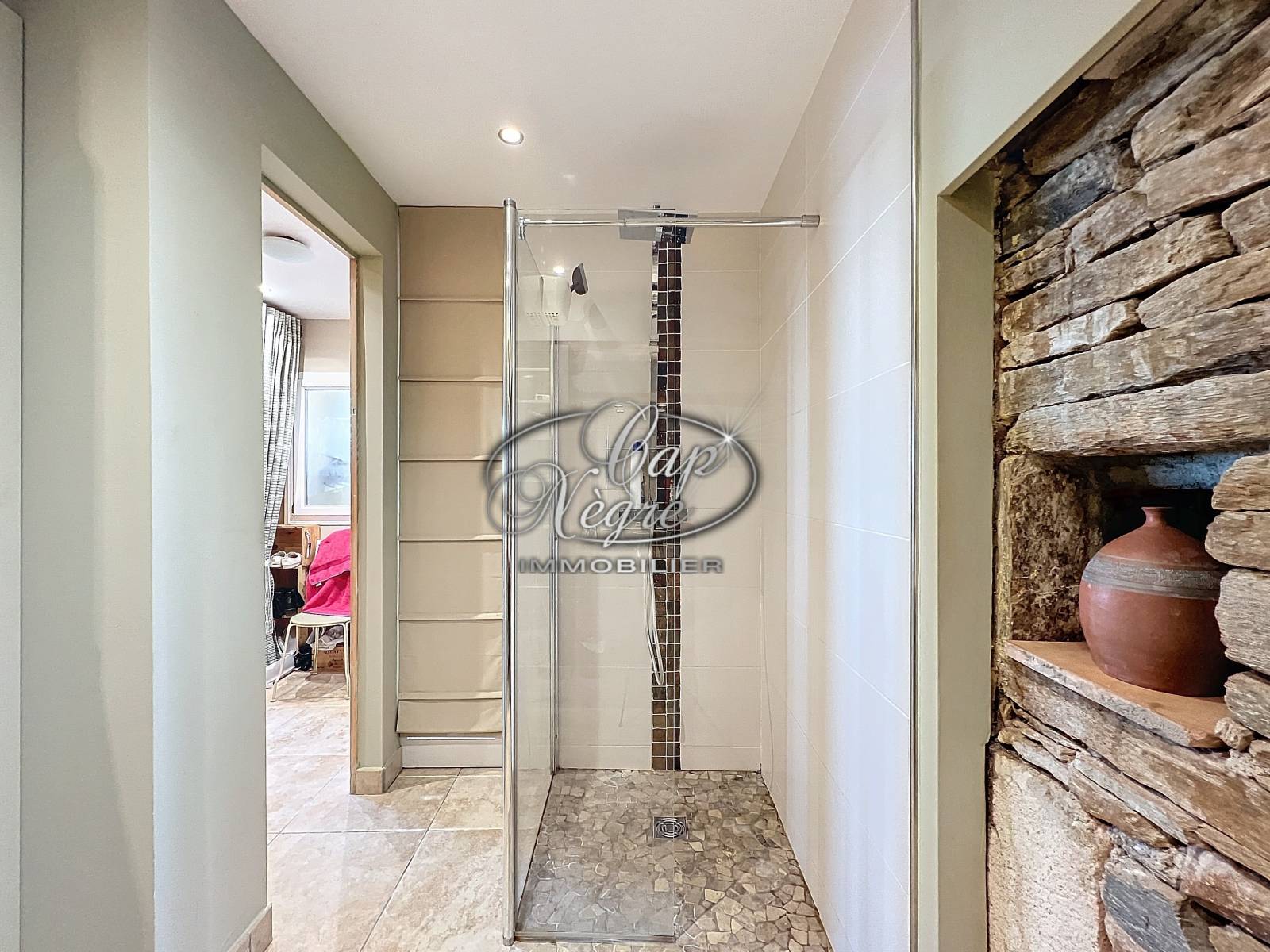 La maison attenante dispose d’un spacieux séjour, d’une cuisine fonctionnelle, de nombreux rangements, d'une salle d'eau avec un mur en pierres apparentes, des placards intégrés et des WC indépendants. Le coin bibliothèque est idéal pour les moments de détente. La chambre parentale, climatisée, bénéficie d’un balcon privé, et la terrasse sur le toit, aménagée d’un store, permet de profiter pleinement de la vue panoramique.